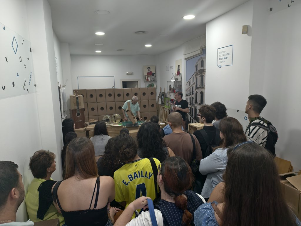 Durante la tarde pudimos disfrutar de una visita guiada a la recién inaugurada exposición de «Picasso: vida con Françoise» del Museo Casa Natal Picasso, para, a continuación, recibir una breve charla en el aledaño taller por parte de Hugo Domínguez, luthier del mítico grupo argentino Les Luthiers, acerca de la recreación de instrumentos que aparecen en las pinturas cubistas de Picasso a realizar con materiales reciclados.